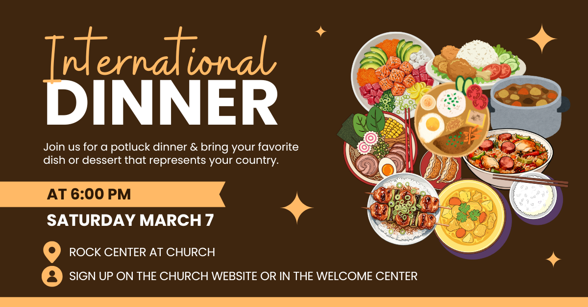 Please fill out this form to sign up you and your family for the International Dinner. Help is needed to set up and clean up. Please select if you will be bringing an appetizer, side dish, entree, or dessert (enough for 10 people).